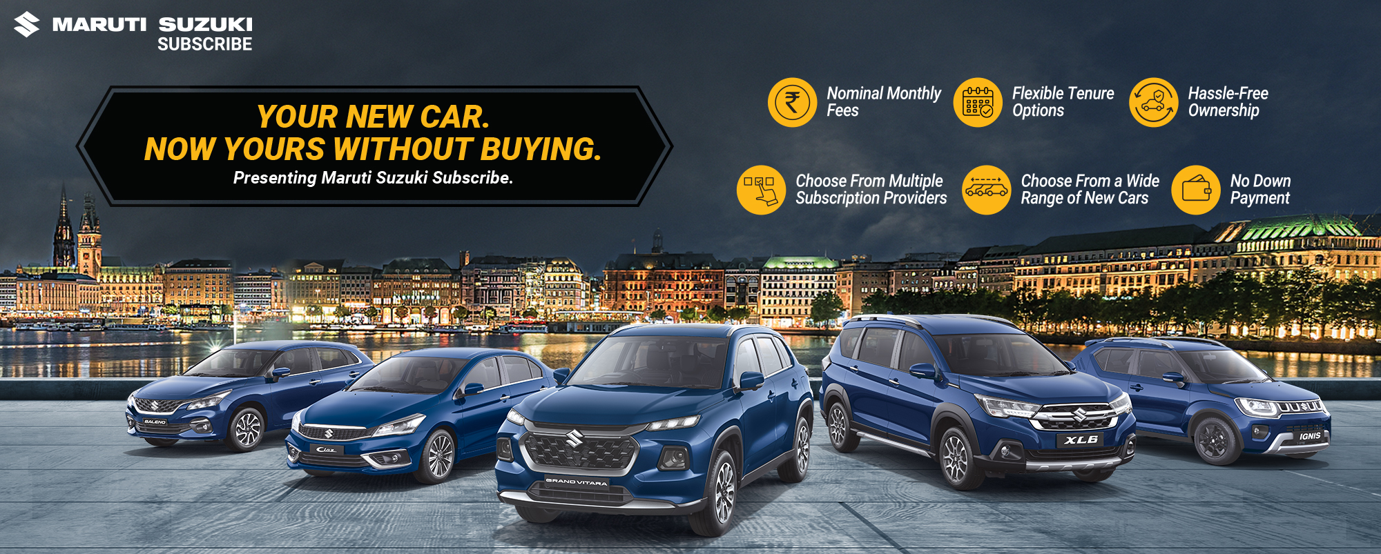 Maruti Suzuki Subscribe enables all customers to enjoy driving their preferred Maruti Suzuki cars without having to deal with all the financial responsibilities that come with owning a car.All you need to do is opt for a monthly subscription plan at a fixed monthly fee, which includes the routine maintenance and insurance costs, and choose a flexible tenure. At Shubh Motors in, NEXA Madan Mahal Jabalpur, Jabalpur, all Hatchback, Sedan, SUV, the MUV models line-up includes Baleno, Invicto, EVitara, Jimny, Ciaz, Ignis, Fronx, Grand Vitara, XL6. Here, you will enjoy Maruti Suzuki Subscribe benefits such as:
